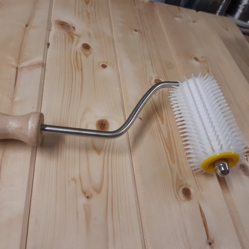 Plastový ostnatý váleček, má dřevěnou rukojeť a kovové tělo. Plastový váleček slouží k rychlému a snadnému porušení plástů i s víčky při výskytu tuhých medů. Vyzkoušejte plastový ostnatý váleček při odvíčkování a vytáčení tuhých medů