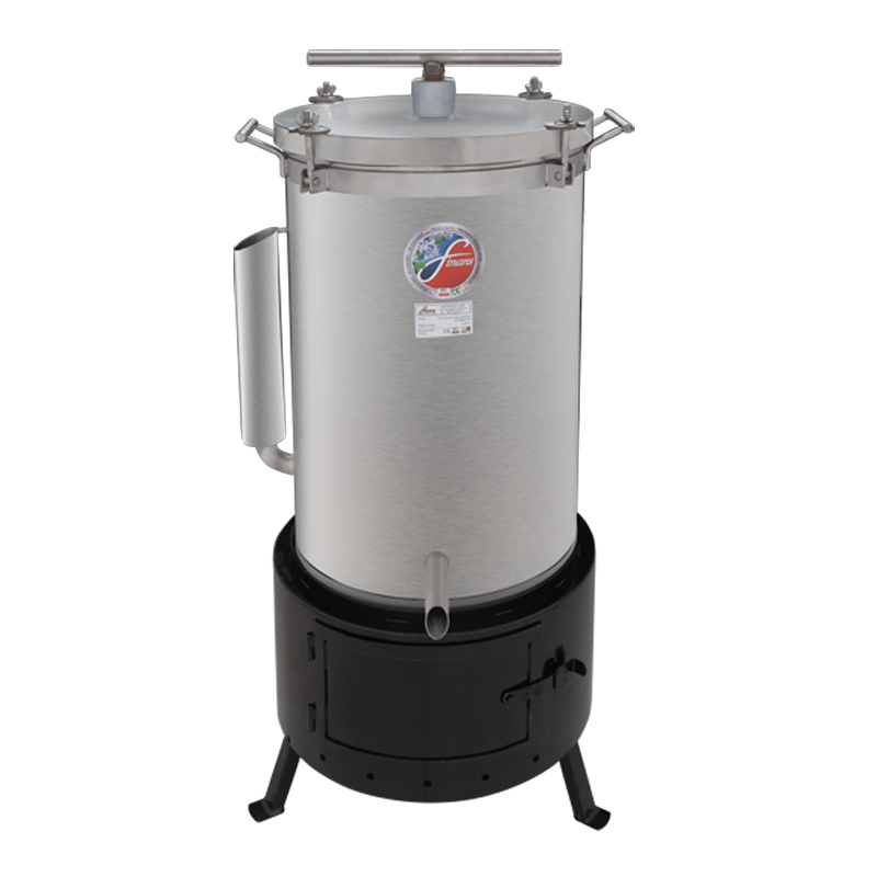 - Duální možnosti ohřevu: Zařízení je dodáváno se speciálním kotlem s vývodem na kouřovod (průměr 120 mm) pro topení tuhým palivem (dřevo). Kotel lze jednoduše vytáhnout z kotliny a lis tak můžete umístit přímo na dvojplotýnku nebo plynový hořák (externí hořák není součástí).